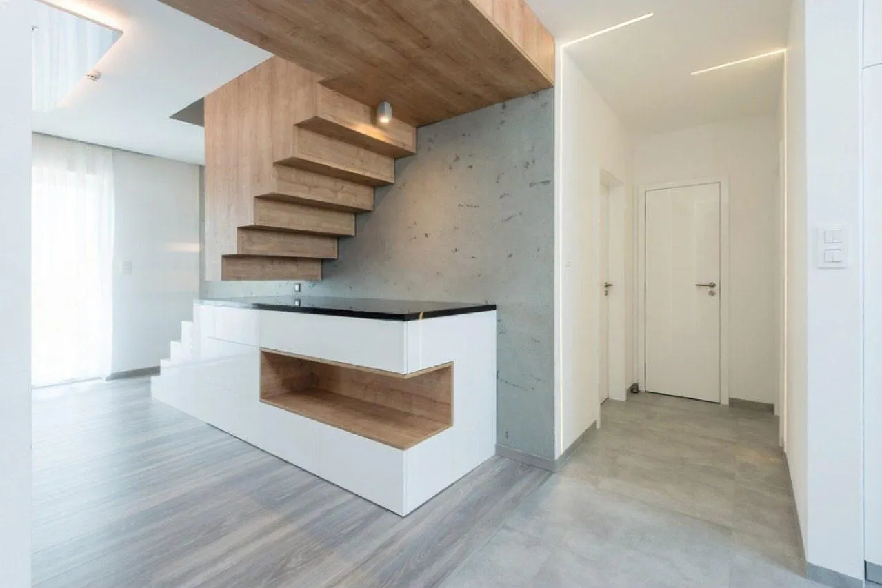 Основание лестницы представляет собой монолитный белоснежный подиум, на который установлена столешница из искусственного камня. Верхний марш выполнен в виде «парящего» короба. Технически, это сложная консольная конструкция, которая крепится к капитальной стене, что и создает эффектный образ зависшего в воздухе элемента. Весь ансамбль смотрится как единое, гармонично спроектированное пространство.